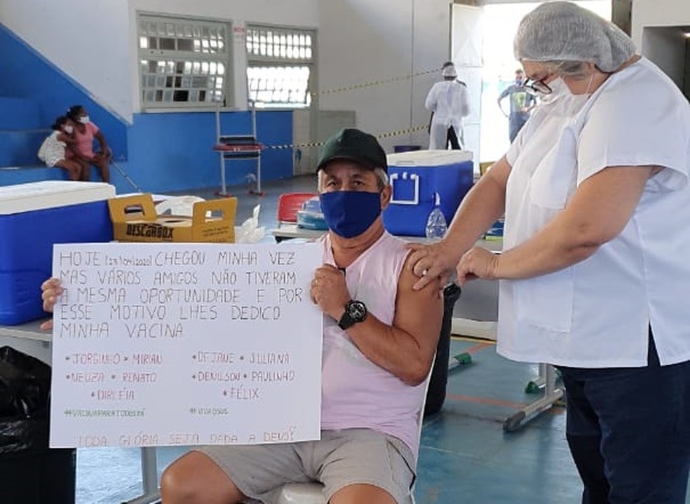 Um idoso de 62 anos prestou uma homenagem aos amigos que morreram vítimas da Covid-19 ao ser vacinado contra a doença na última sexta-feira (23), em Rio das Ostras, na Baixada Litorânea do Rio. Com um cartaz nas mãos citando o nome de amigos que perderam a luta para o novo coronavírus, Elson Porto recebeu a primeira dose da vacina de Oxford/AstraZeneca.“Hoje (23) chegou a minha vez, mas vários amigos não tiveram a mesma oportunidade e por esse motivo lhes dedico a minha vacina”, dizia o cartaz.