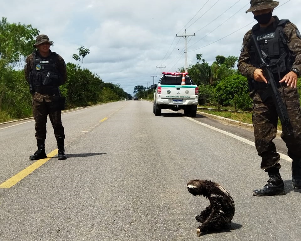 O animal cujo nome científico é bradypus variegatus, foi tirado do local para evitar um atropelamento e levado pelo Pelotão Ambiental, que devolveu o animal ao seu habitat natural.
