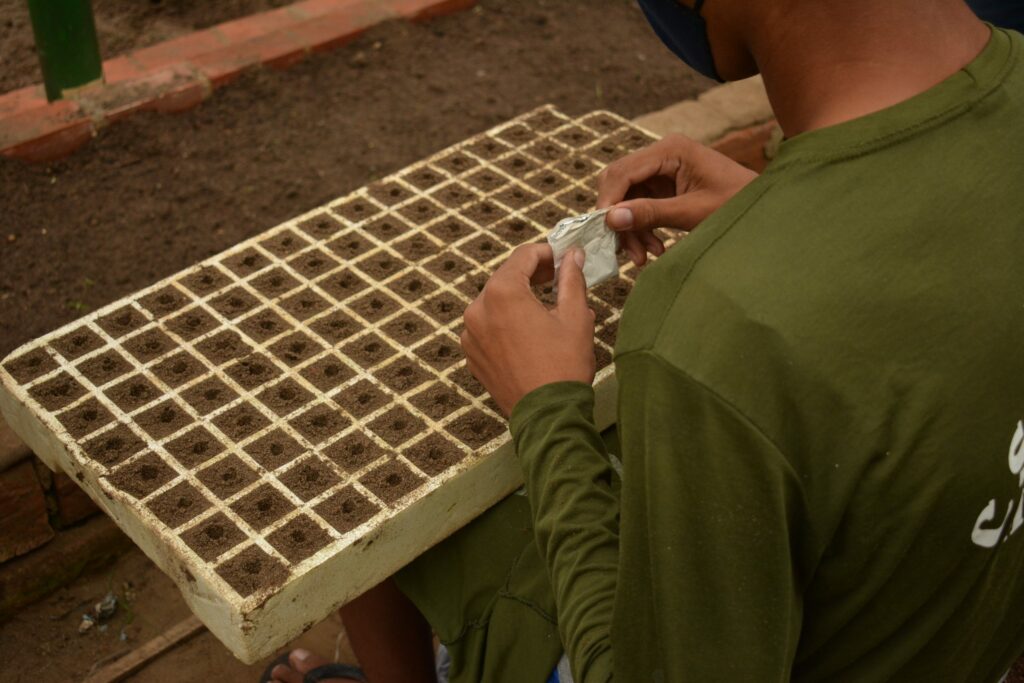 “O momento de aprendizagem é feito de forma organizada. Sempre que vamos fazer o plantio de alguma verdura, seguimos um planejamento. Agora, estou plantando rúcula. Começarei semeando as sementes nas bandejas, que contém 60 quadrinhos. Cada quadro pode ter até três mudas, caso contrário, algumas morrerão. Essa é a etapa inicial. Depois iremos adubar, manusear e manter o potencial hidrogeniônico (ph) do solo para receber cada planta”, explica V.L., um dos adolescentes da unidade, ao narrar os conhecimentos adquiridos com o projeto.