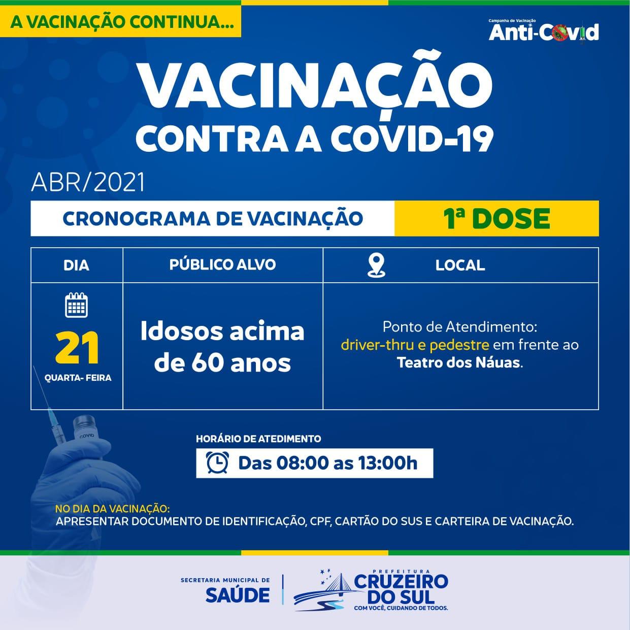 A Prefeitura de Cruzeiro do Sul, através da Secretaria Municipal de Saúde, vai realizar mais um dia de vacinação anti-covid, voltado para idosos acima de 60 anos de idade. A ação ocorre nesta quarta-feira, dia 21 de abril, no Teatro dos Nauas, das 8 as 13h .