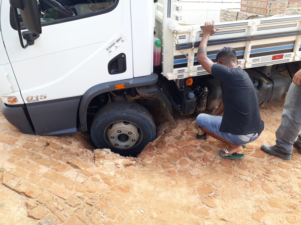 O caminhão que ficou preso no buraco só conseguiu sair do local depois que foi puxado por um outro carro com o auxílio de um cabo de aço.