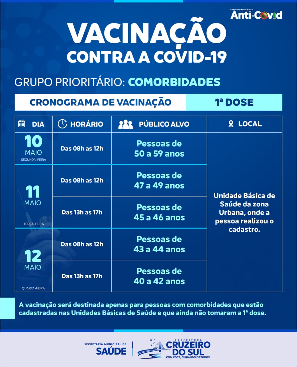 De acordo com o Secretário Municipal de Saúde, Agnaldo Lima, a imunização acontece dia 10 de maio para as pessoas de 50 a 59 anos, que por algum motivo não foram vacinadas durante a última semana, e vai até o dia 12 de maio, onde incluir as pessoas com idade acima dos 40 anos.