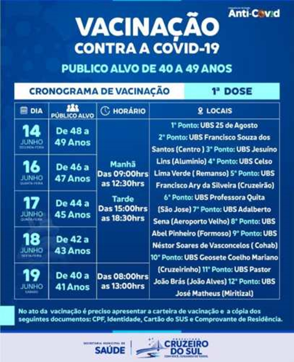 Todos os postos de vacinação da zona urbana estarão vacinando, a cada dia um grupo será atendido. Já a partir desta segunda-feira, 14, terá início a vacinação para população de 49 e 48 anos, que segue – em ordem decrescente – até sábado com as pessoas de 41 e 40 anos.