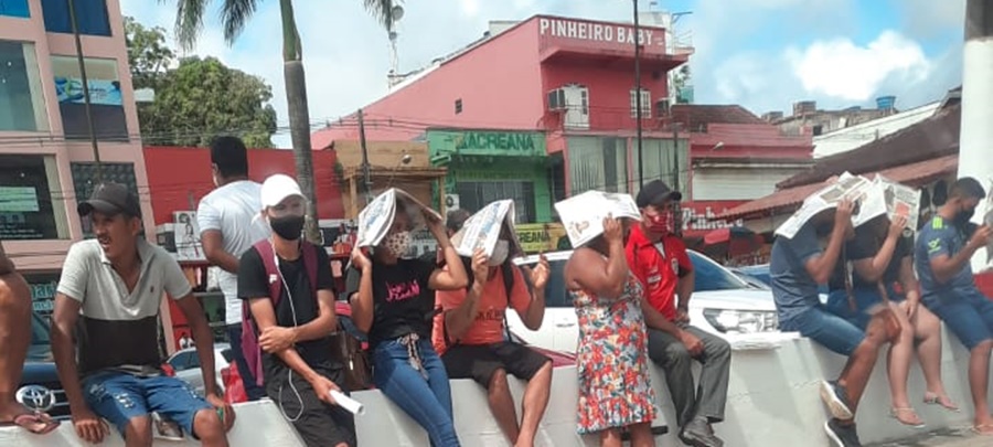 Na manhã dessa terça-feira (01), identificamos que a fila para o saque em espécie se estendia ao redor de todo o coreto da Praça Orleir Cameli. Inúmeras pessoas: idosos, gestantes e jovens de todas as idades aguardavam o atendimento na extensa fila de forma aglomerada, sem respeitar o distanciamento social – importante medida para reduzir o avanço da pandemia da Covid-19, de acordo com a OMS.