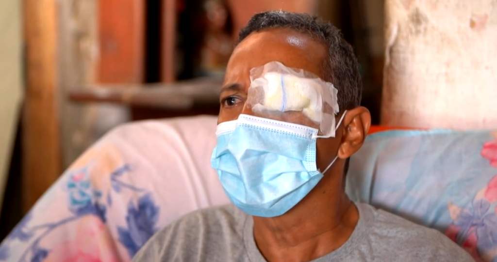 “Eu disse a ele, ‘eu tô no protesto não, sou trabalhador, acabei agora de descarregar um contêiner’. O policial saiu de trás, mirou e deu no meu olho. Na mesma hora, já entrei em desespero que essa visão apagou na hora”, conta Jonas.