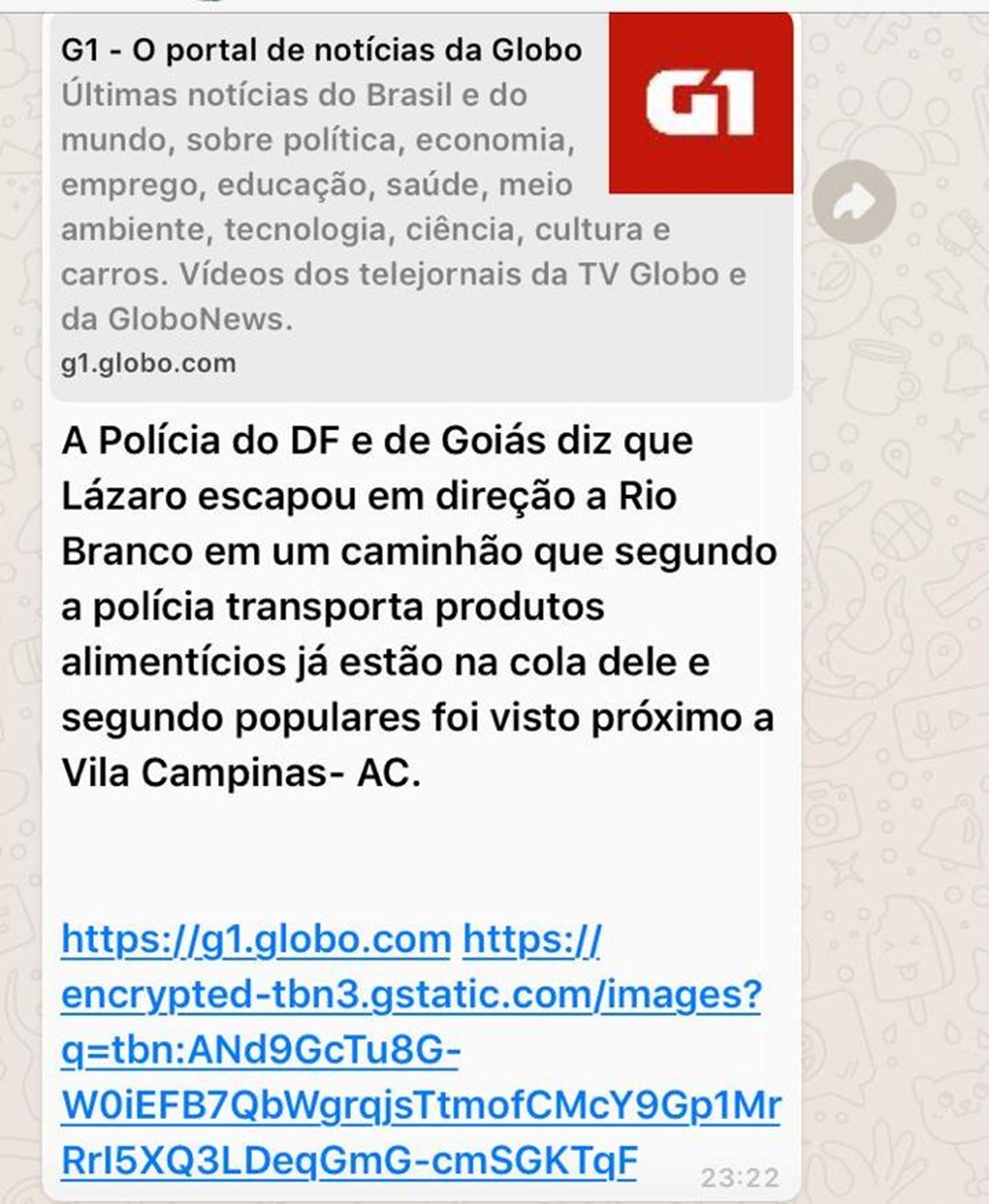 Uma imagem que circula em vários grupos de WhatsApp está deixando a população do estado do Acre em pânico. A imagem afirma que o serial killer Lázaro Barbosa estaria vindo em direção a Rio Branco, dentro de um caminhão que transporta alimentos; e que já teria sido visto próximo à Vila Campinas (AC).