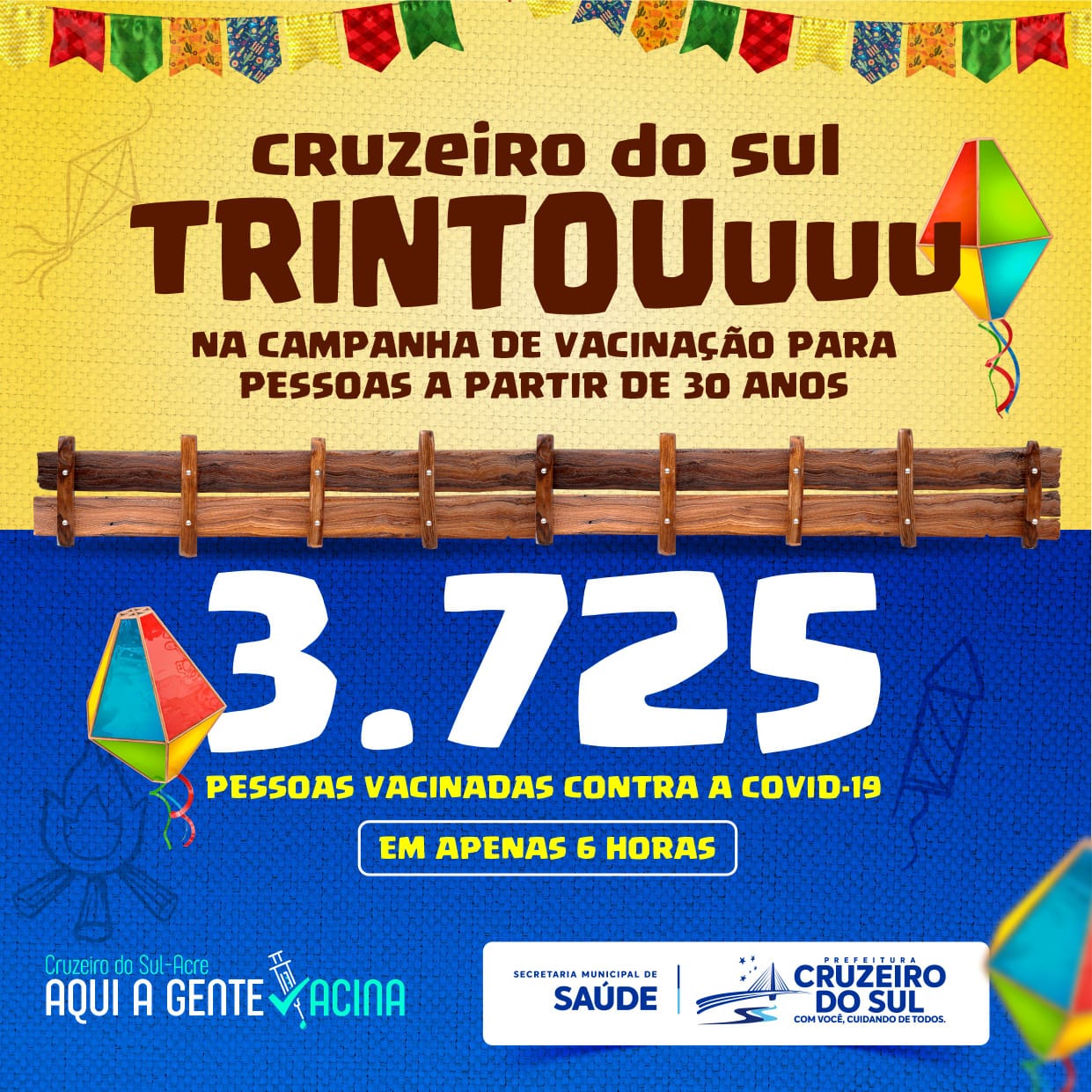 A imunização contra a Covid-19 está avançando na cidade de Cruzeiro do Sul. Somente nesta quarta-feira (23), durante a campanha “Trintou na vacinação de São João”, que tinha como objetivo vacinar pessoas a partir dos 30 anos de idade, foram imunizadas 3.725 pessoas.