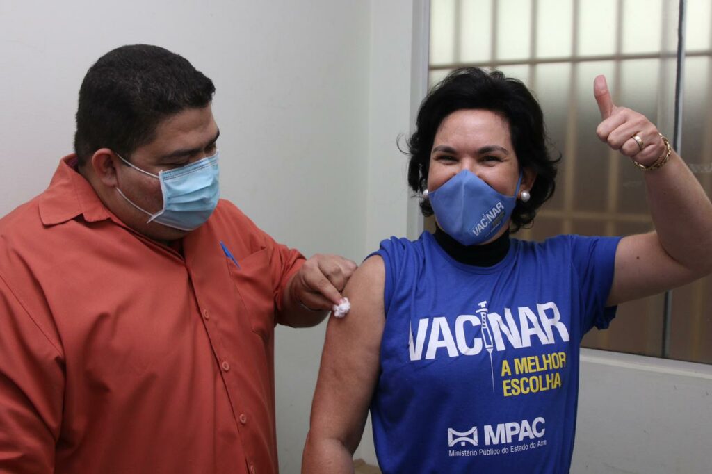 Nesta segunda-feira, 21, a procuradora-geral de Justiça, Kátia Rejane de Araújo Rodrigues, tomou a primeira dose do imunizante contra a Covid-19, na Unidade de Referência em Ação Primária (Ura) do Bairro Vila Ivonete, em Rio Branco.