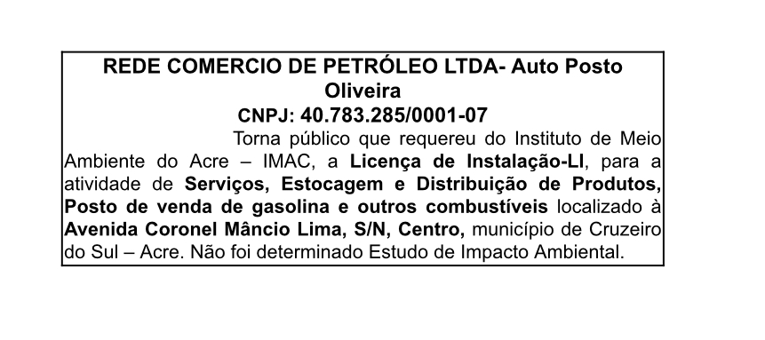 Torna público que requereu do Instituto de Meio Ambiente do Acre – IMAC, a Licença de Instalação–LI, para a atividade de Serviços, Estocagem e Distribuição de Produtos,Posto de venda de gasolina e outros combustíveis localizado à Avenida Coronel Mâncio Lima, S/N, Centro, município de Cruzeiro do Sul – Acre. Não foi determinado Estudo de Impacto Ambiental.
