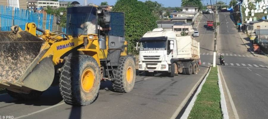 Nesta terça-feira (20), uma carreta que transportava, cerca de dois mil metros de grama, de Porto Velho, para Cruzeiro do Sul, onde será utilizada na recuperação do gramado do Estádio Arena do Juruá, não conseguiu subir a ladeira da Rua Lauro Muller, próximo ao cemitério São João Batista e travou no meio da via, tendo que ser rebocado por uma pá-mecânica.