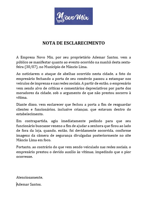 A atitude do proprietário Ademar Santos foi duramente criticada nas redes sociais. A esposa do empresário entrou em contato com a equipe do jornal O Juruá em Tempo para os devidos esclarecimentos dos fatos.