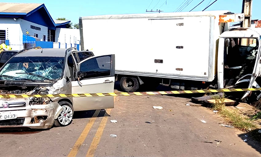 Com isso, colidiu na lateral da cabine do caminhão baú de transportes de frios. Com o impacto, o motorista do caminhão perdeu o controle da direção, subiu na calçada e derrubou o muro de uma residência. Já o carro (Fiat Idea) ficou com frente e para-brisa destruídos.