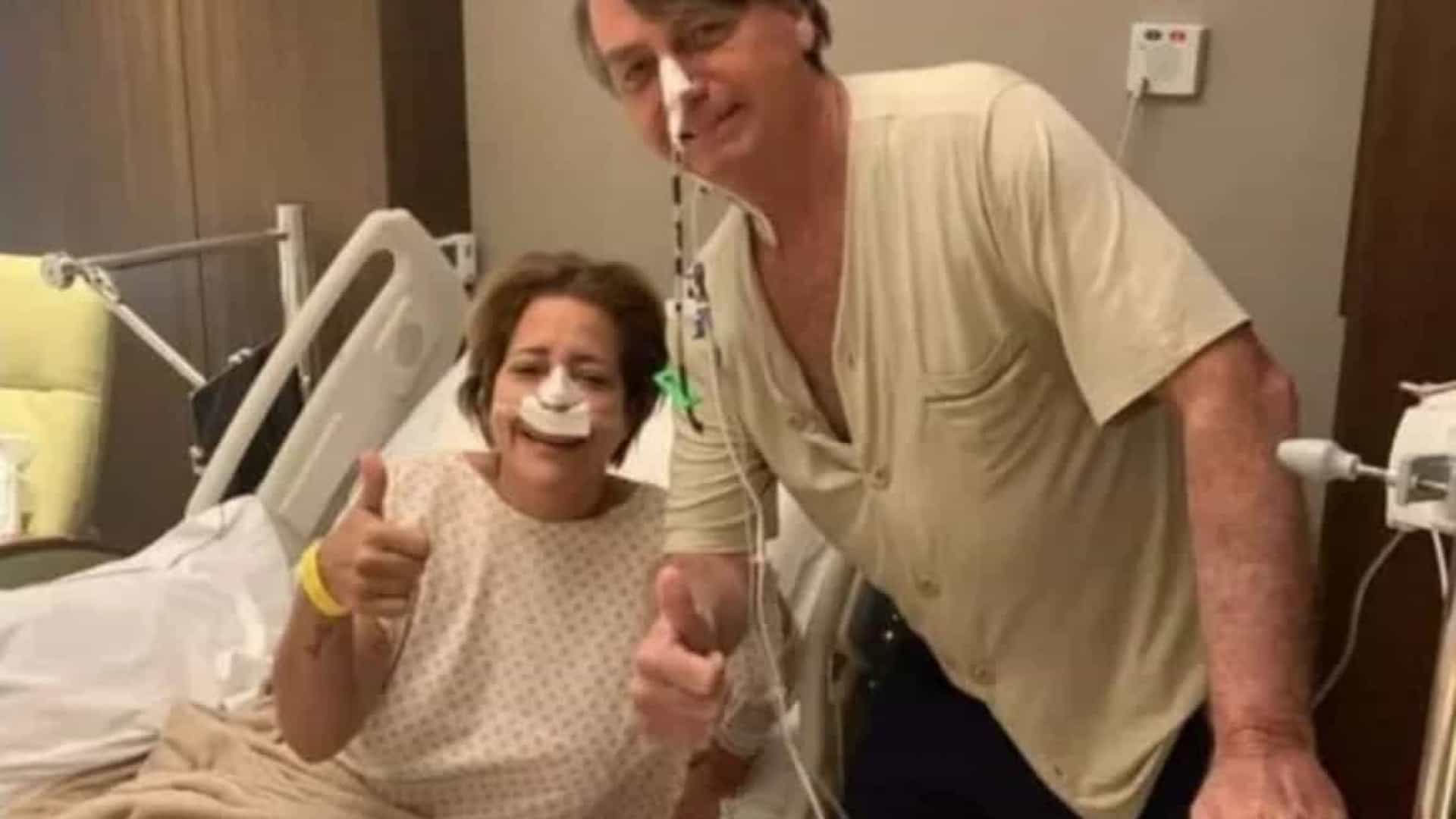 A primeira-dama Michelle Bolsonaro publicou foto no Instagram em que o presidente Jair Bolsonaro aparece em pé, com sondas presas ao nariz e ao lado de uma paciente deitada numa cama de hospital. “Custoso demais”, escreveu Michelle.