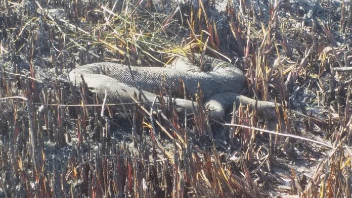 Outro caso foi o de uma anta, um cateto e uma sucuri de cerca de 5 metros e 80 kg, encontrada carbonizada na manhã deste domingo (11). “Estávamos fazendo a vistoria nas proximidades da fazenda São João, ainda na parte da área de Bonito, quando nos deparamos com esta sucuri que, infelizmente, não conseguiu se livrar das chamas. Lamentável”, comentou o capitão Valdeck de Siqueira Santos.