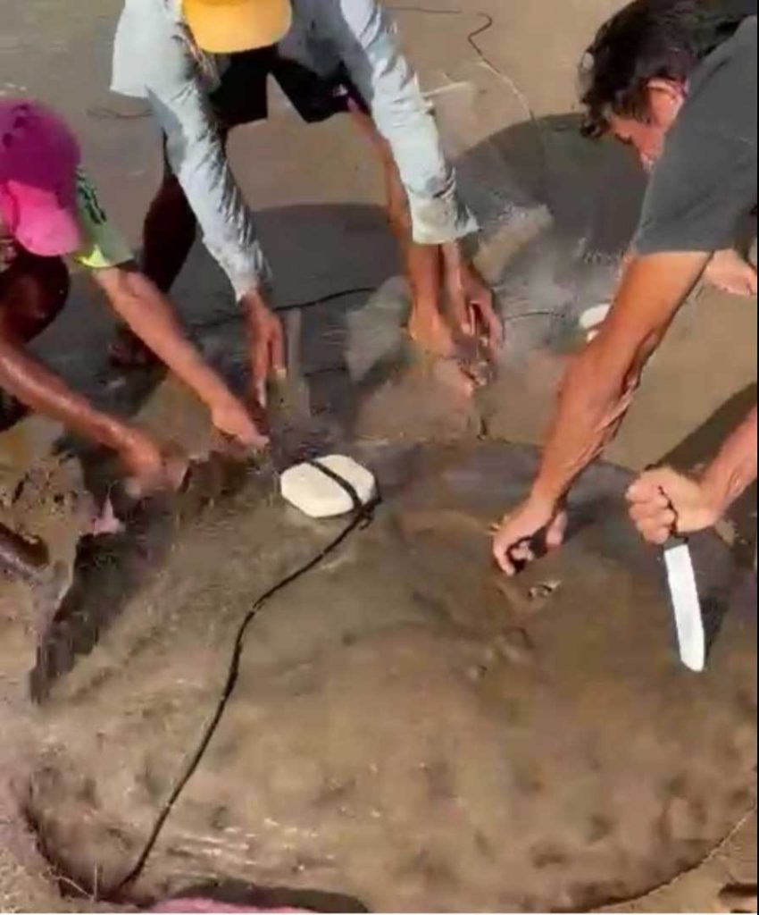Uma arraia gigante chamou atenção de pescadores na praia do Moa, em Cruzeiro do Sul. O animal ficou preso em um curral de pesca, uma espécie de armadilha para prender peixes.
