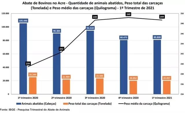 O levantamento destacou ainda, a redução no peso total das carcaças. No ano passado, o Acre acumulou 25.249 toneladas de carcaças bovinas nos primeiros três meses. Em 2021, esse número reduziu para 20.097 toneladas.