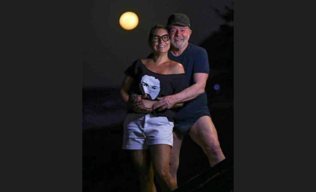 O ex-presidente Lula, de 75 anos, surgiu mais à vontade ao lado da noiva, a socióloga Rosângela Silva, conhecida como Janja. Os dois curtiam um banho de lua no Ceará. Na imagem, o casal aparace abraçado e bastante sorridente. Na ocasião, Lula usava apenas um boné, camiseta e sunga.