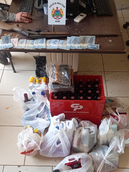 Duas guarnições atenderam à ocorrência. Os policiais encontraram dentro do veículo uma espingarda calibre .28 com uma munição, uma quantidade de dinheiro nacional, além dos bens que estavam sendo roubados do comércio da vítima, entre eles engradados de bebidas alcoólicas, materiais de limpeza e mantimentos.