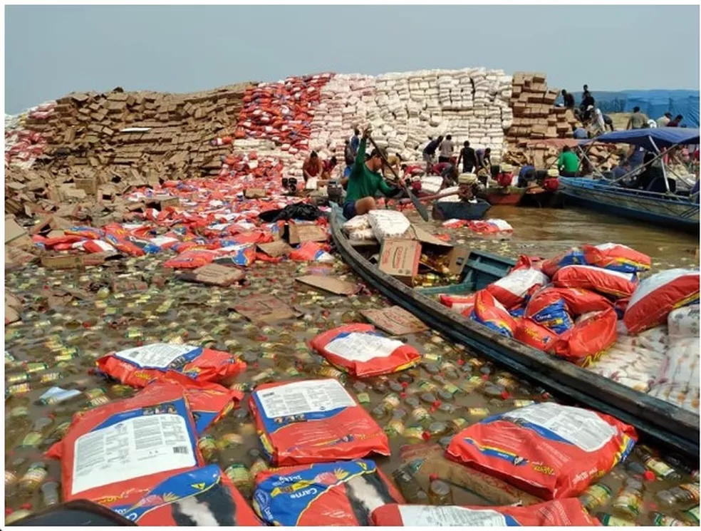 Como a balsa ficou parcialmente virada na água, moradores da região se aproximaram em pequenos barcos e começaram a levar a carga.