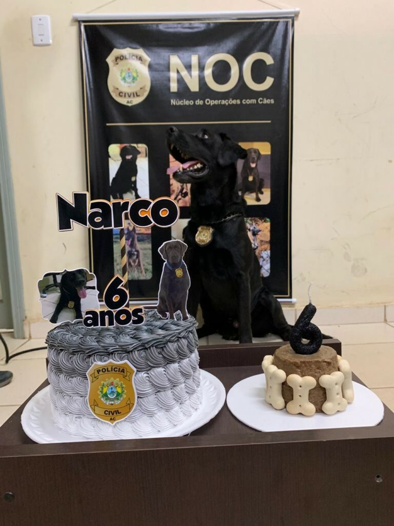 A festa ocorreu na delegacia da 1ª Regional, em Rio Branco, onde o Narco, que é da raça labrador, mora desde o início deste ano. Especializado em farejar drogas e armas de fogo, o cão policial iniciou suas funções em Cruzeiro do Sul, no interior do estado, em 2017.