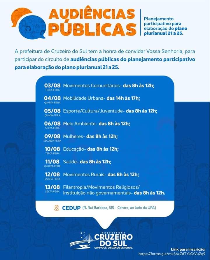 A prefeitura de Cruzeiro do Sul realizará durante os 03 à 13 de agosto, audiências públicas que envolverão os diversos segmentos da sociedade. Durante a ação, será elaborado o plano plurianual de 2021 a 2025, e terá o objetivo de planejar as ações de desenvolvimento de políticas públicas, que visam o desenvolvimento a curto, médio e longo prazo do município de Cruzeiro do Sul.