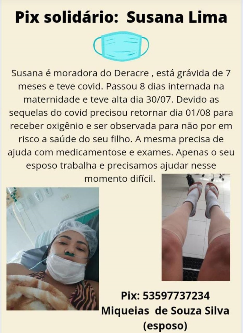 Susana teve que ficar internada na Maternidade Hospital da Mulher e da Criança do Juruá, em Cruzeiro do Sul, por 8 dias. Recebeu alta, mas devido as sequelas retornou no dia 01 de agosto para receber oxigênio e ser observada para não colocar em risco a vida do seu filho e permanece internada sem previsão de saída.