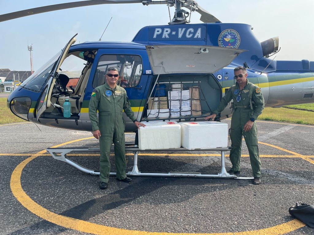 Em mais uma missão que objetiva a agilidade de forma que assegure a população, um dos helicópteros do governo do Estado, o Harpia 03, realizou na manhã deste sábado, 14, a entrega de vacina contra a Covid-19 e outros imunizantes que integram o calendário vacinal, nos municípios de Porto Walter e Marechal Thaumaturgo, cujo acesso só é possível por meio aéreo ou fluvial, via Cruzeiro do Sul.