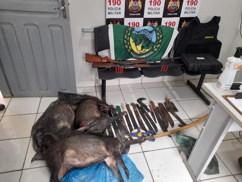 A Polícia Militar do Acre (PMAC) prendeu neste domingo, 22, vinte e duas pessoas pela invasão de uma propriedade rural no município de Acrelândia, no interior do Acre. Com eles foram apreendidas duas espingardas com munições e três animais silvestres abatidos, além de duas motosserras, facões e foices usadas no desmate ilegal da área invadida.