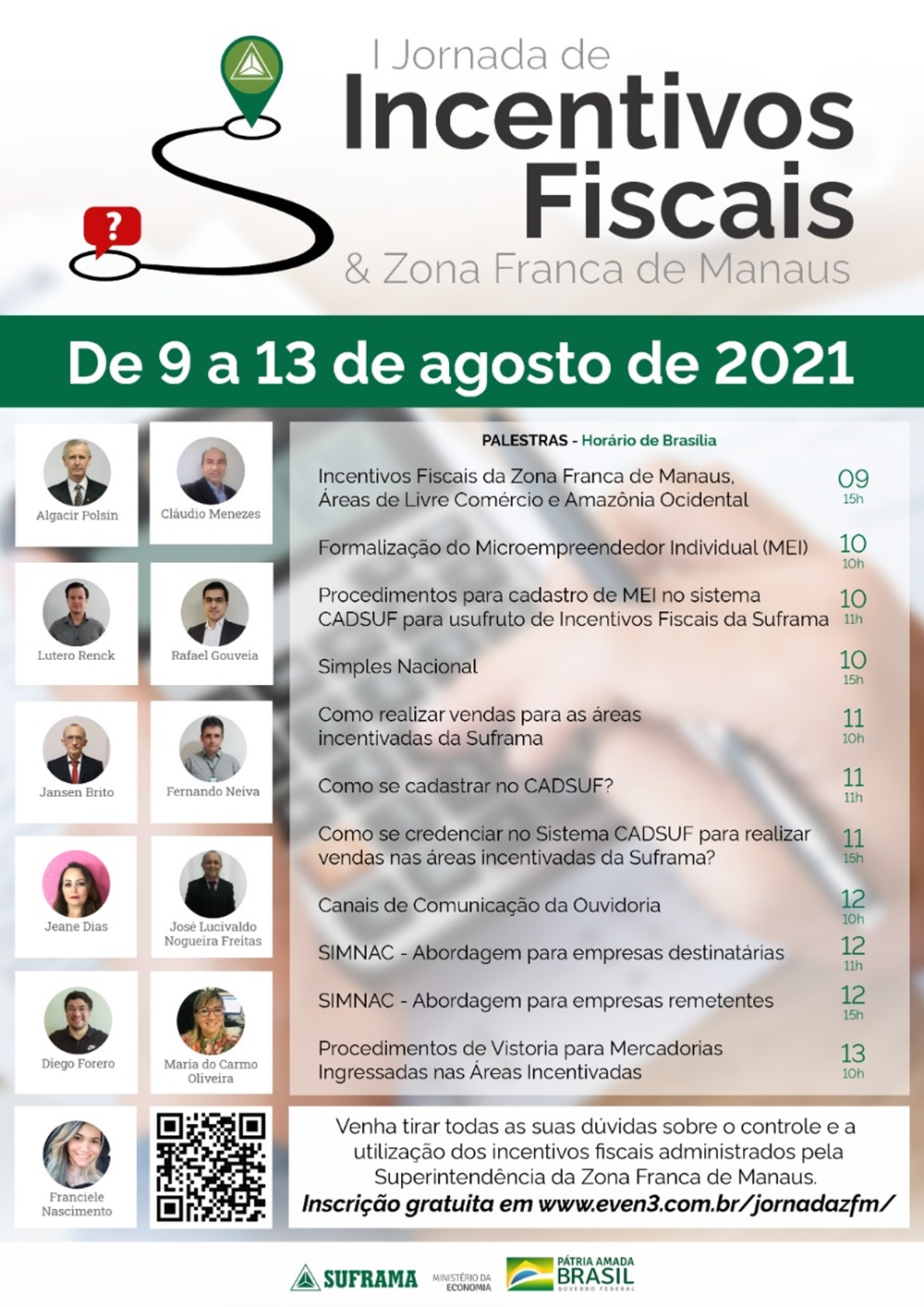 As inscrições para a I Jornada de Incentivos Fiscais & Zona Franca de Manaus estão abertas e podem ser feitas gratuitamente pelo site www.even3.com.br/jornadazfm. Entre os palestrantes, além de servidores da Suframa, estão representantes de órgãos como a Receita Federal, Secretarias Estaduais de Fazenda e Serviço Brasileiro de Apoio às Micro e Pequenas Empresas (Sebrae). As palestras terão duração média de 45 minutos, com 15 minutos adicionais para a resposta de dúvidas. Haverá certificado de participação ao final da Jornada.