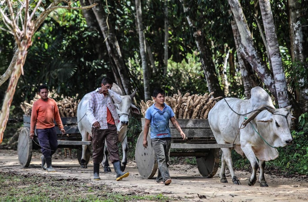 A associação diz que são cerca de 700 indígenas dentro da comunidade indígena. O trabalho, desde a plantação, colheita e produção da farinha, é coletivo e envolve todos – exceto idosos e crianças. E eles vendem as sacas para atravessadores que compram direto na aldeia.