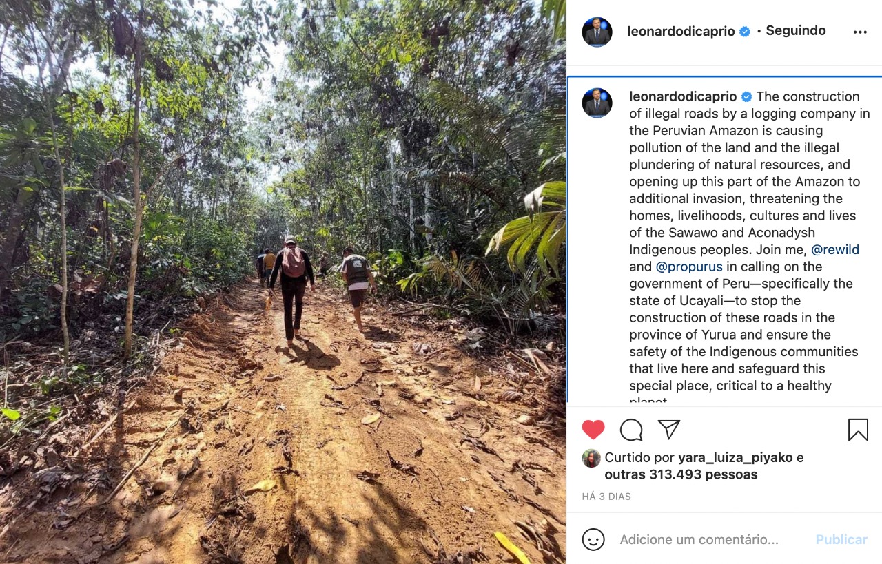 O ator e ativista ambiental Leonardo DiCaprio usou sua página no Instagram para denunciar o avanço da estrada UC-105, que está sendo reaberta de forma ilegal, no Peru, entre as comunidades Nueva Italia e Puerto Breu, distrito de Ucayalli.