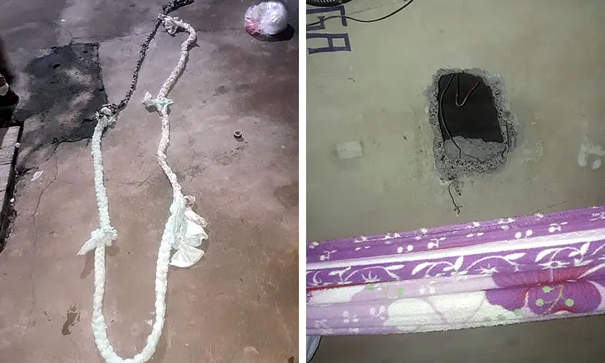 Os profissionais realizaram uma verificação em todas as celas do pavilhão e encontraram um buraco na cela 16, onde também encontraram dois ferros pontiagudos e uma corda feita de pedaços de tecido, que possivelmente seriam usados na fuga.