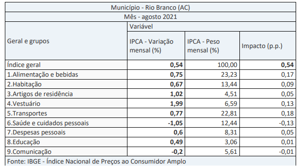 Em agosto, o Índice de Preços ao Consumidor Amplo (IPCA) de Rio Branco, foi de 0,54%. Em setembro, pelo segundo mês consecutivo, o índice da capital ficou abaixo da média do Brasil (0,87%), inicialmente isso parece bom, entretanto, ao longo prazo vê-se que que no último ano a inflação foi de 11, 97% na capital e 9,68% em nível nacional.