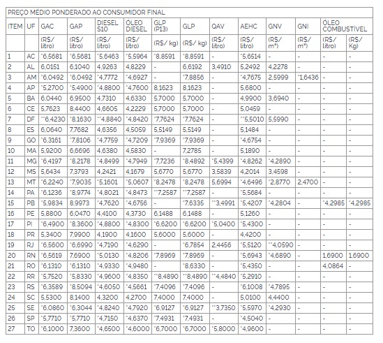 A tabela registra os preços de referência da gasolina comum, gasolina premium, diesel, gás liquefeito de petróleo (GLP), etanol e óleo combustível. Todos os combustíveis regulados pelo Confaz foram reajustados. Um exemplo disso é o gás de cozinha, que será comercializado a R$ 8,85 o quilo.