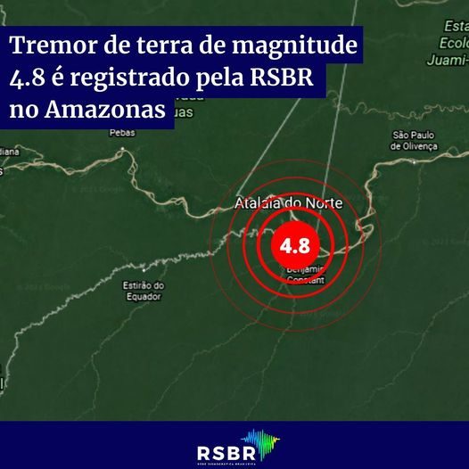 Rede Sismológica Brasileira – Na noite de quarta-feira ( mais precisamente às 22h14 (horário de Brasília) um tremor de terra de magnitude 4.8 ocorreu no município de Atalaia do Norte, no interior do estado do Amazonas. O abalo sismico de magnitude considerada mediana para os níveis do Brasil foi registrado pelas estações da Rede Sismográfica Brasileira e confirmado pelo Serviço Geológico do Brasil instituição que apoia a RSBR.