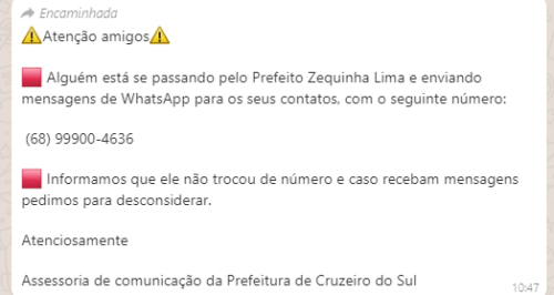 A prefeitura do município de Cruzeiro do Sul (AC), emitiu um informativo na manhã desta sexta-feira (29), alertando a população e contatos, que golpistas estão enviando mensagens de um número de WhatsApp, se passando pelo prefeito Zequinha Lima (PP).