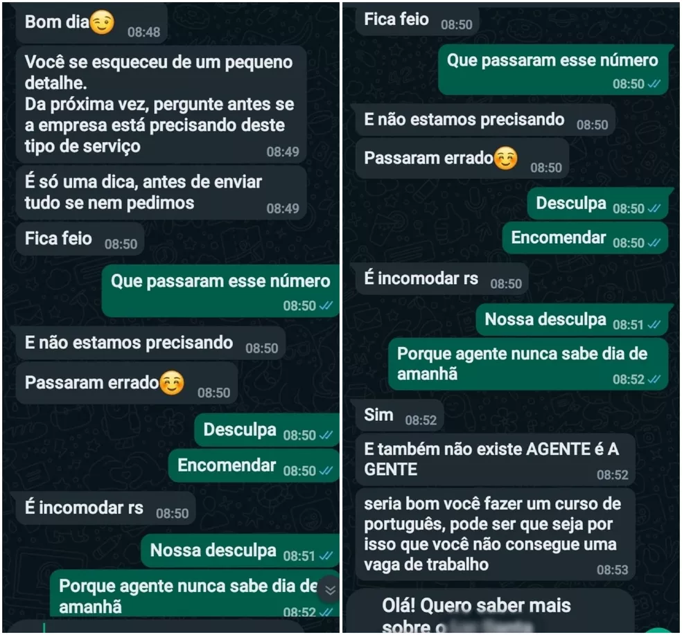 Uma cuidadora de idosos de 43 anos foi hostilizada pela atendente de um asilo de Sorocaba (SP) na última quinta-feira (14). Por causa de alguns erros nas mensagens, a funcionária sugeriu que Cristiane Barros fizesse um curso de português e disse que era “por isso que ela não arrumava trabalho”.