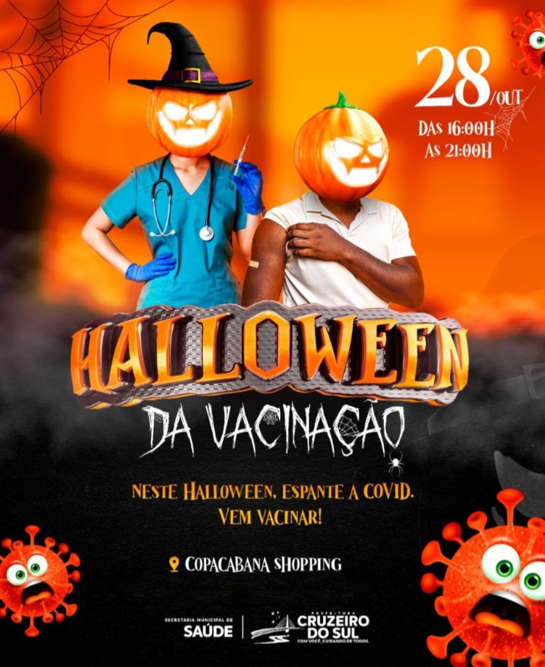 Na próxima quinta-feira (28), a prefeitura de Cruzeiro do Sul (AC), realiza a ação Halloween da vacinação, no shopping Copacabana. Serão aplicadas as vacinas contra a Covid-19, as 1ª, 2ª e 3ª dose de reforço poderão tomar desta vez.