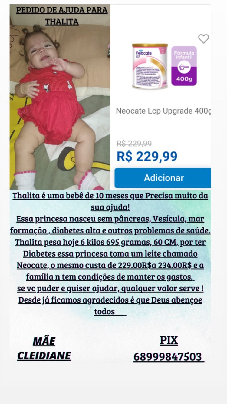 Comovidos com a situação de Thalita, e sem poder ajudar com recursos financeiros alguns familiares decidiram fazer uma campanha nas redes sociais para comprar o leite de Thalita e ajudar Cleidiane no custeio de sua hospedagem em Rio Branco. Uma chave PIX foi disponibilizada para ajudar mãe e filha (68) 99984-7503. “Todo e qualquer valor será muito bem-vindo”, disse a tia de Thalita.