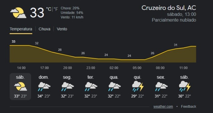 Segundo informou o meteorologista, Davi Friale, em seu boletim divulgado nesta sexta-feira (29), o final de semana seria de muito sol e calor. Em Cruzeiro do Sul (AC), os termômetros bateram 33º C graus de máxima no início da tarde deste sábado (30). A sensação térmica chegou aos 38º C graus.