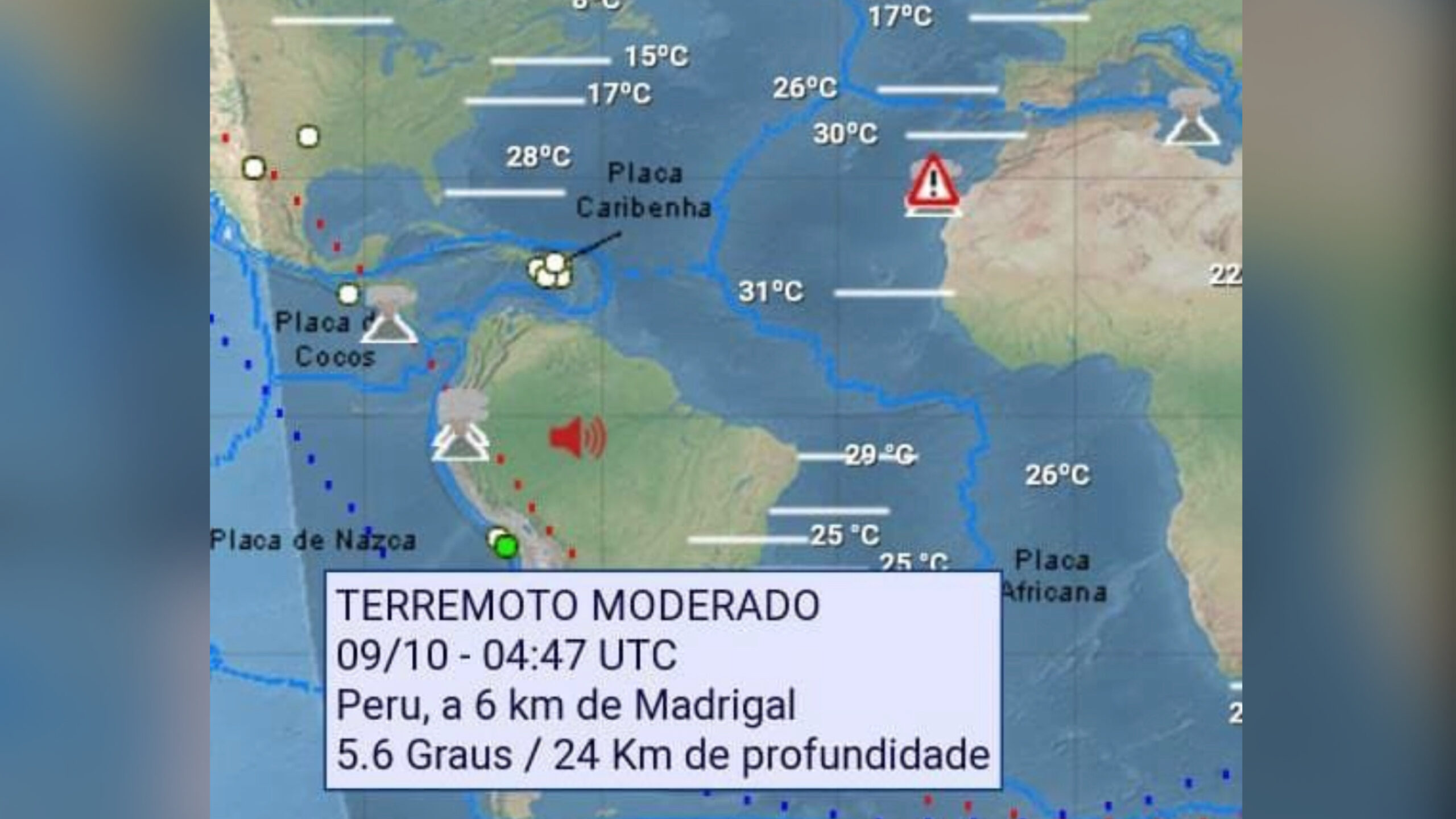 Um terremoto de 5,6 graus na escala Richter atingiu o país vizinho, Peru, neste sábado (09), informou o Centro Sismológico Europeu do Mediterrâneo (EMSC). De acordo com o EMSC, o tremor foi registrado a uma profundidade de 24 km.