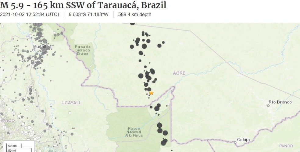 Um terremoto de magnitude 5,9 foi registrado no município de Tarauacá, no interior do Acre, neste sábado (2), de acordo com o Serviço Geológico dos Estados Unidos (USGS).