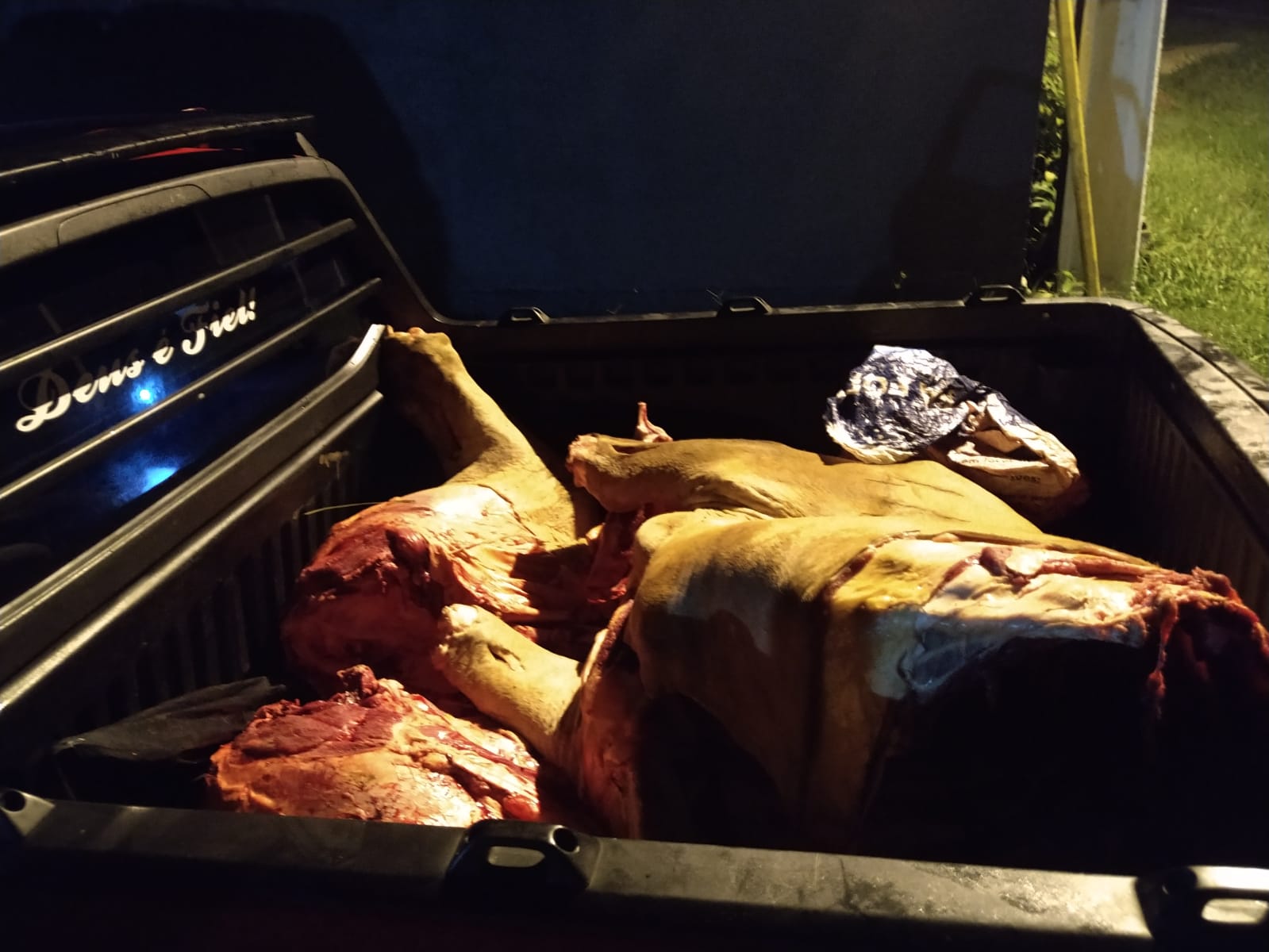 Os militares decidiram abordar, e dentro da carroceria, foi encontrado um boi abatido. Foi solicitado o Guia de Trânsito Animal (GTA), aos ocupantes do carro, pelo fato de se tratar de um produto de furto, eles, não tinham o GTA do animal.