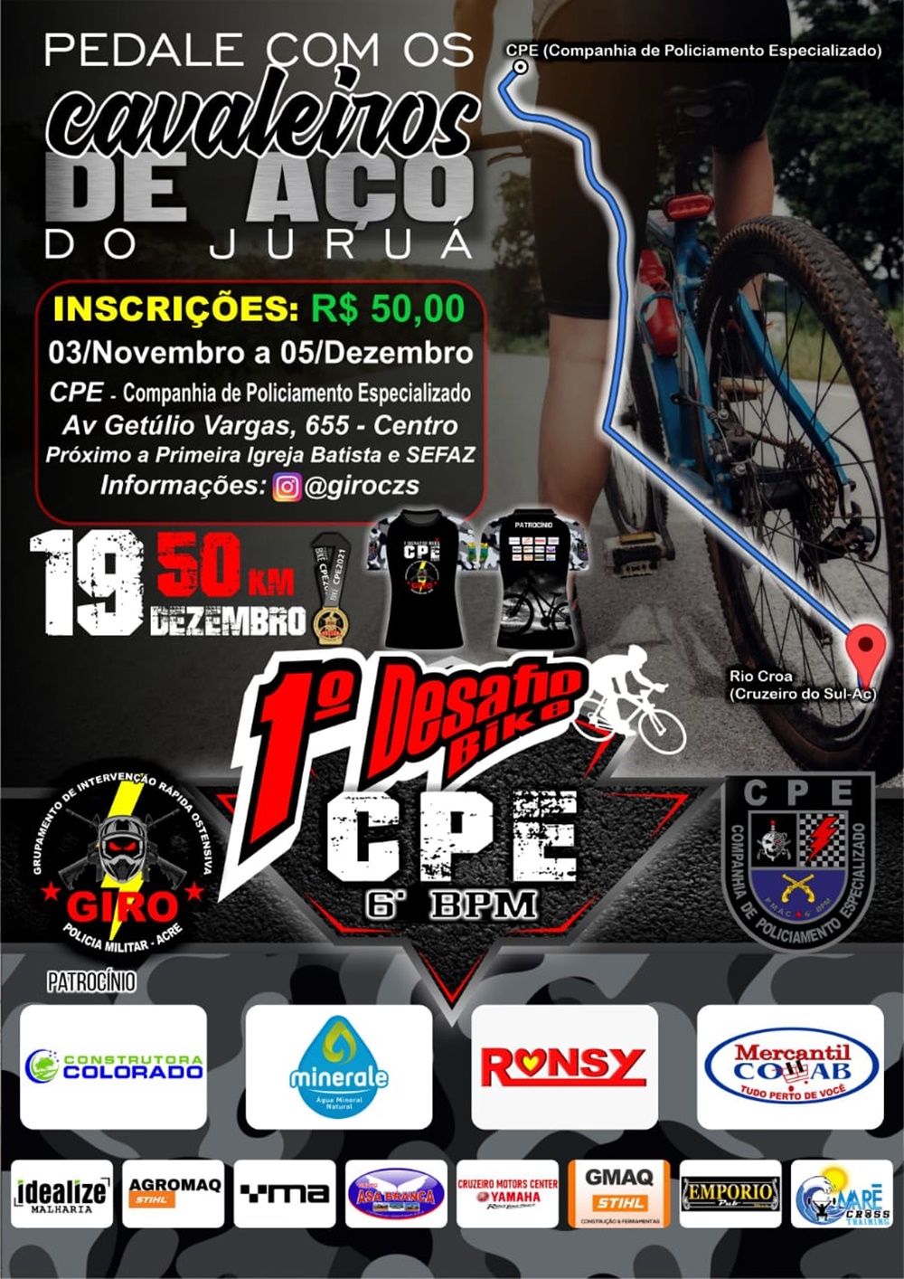 Em comemoração do 47º aniversário do 6° Batalhão da Polícia Militar de Cruzeiro do Sul (AC), a Companhia de Policiamento Especializado – CPE, está realizando o 1° Desafio de Bike “Pedale com os Cavaleiros de Aço do Juruá”, o evento terá um percurso de 50 Km, e acontecerá no dia 19 de dezembro.