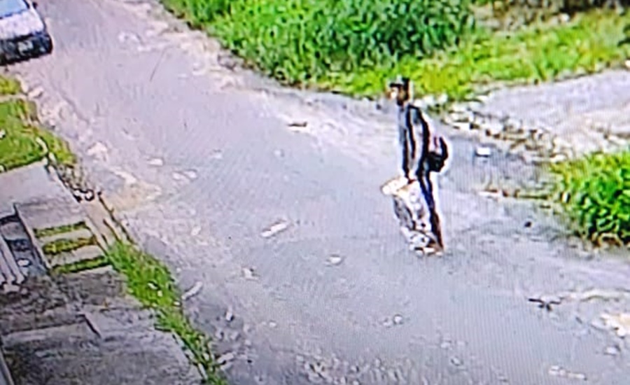 Nas imagens da câmera de segurança de uma casa vizinha, é possível ver o homem, que está usando boné e mochila, olhar ao redor para se certificar de que não há ninguém perto e acaba furtando o objeto.