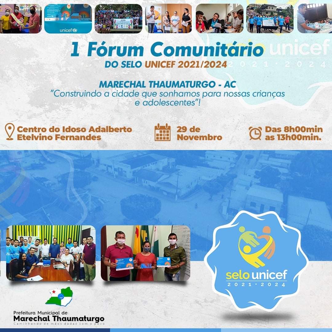 O programa terá início no próximo dia 29 de novembro, no Centro do Idoso Adalberto Etelvino Fernandes, as 7h30min da manhã; com o PRIMEIRO FÓRUM COMUNITÁRIO DO PROGRAMA SELO UNICEF 2021/2024. O tema escolhido foi “Construindo a cidade que sonhamos para nossas crianças e adolescentes”. O referido evento terá a presença de representantes do Fundo das Nações Unidas Para Infância – UNICEF, vindo de Manaus e Brasília, dentre as quais a Oficial de Comunicação da UNICEF do Território Amazônico Elizabeth Cavalcante e a Oficial de Juventude do Brasil, Rayanne França.