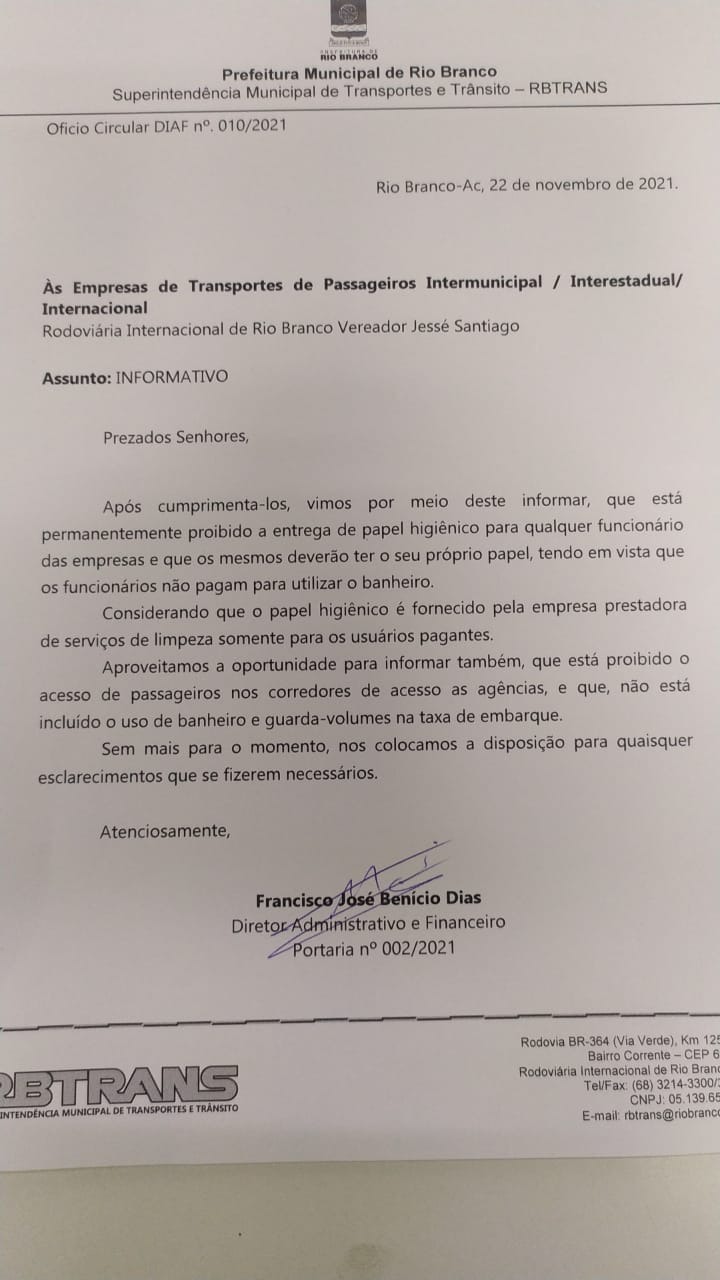 Um informativo assinado pelo diretor administrativo e financeiro da Superintendência Municipal de Transportes e Trânsito (RBTRANS), Francisco José Benício Dias, está causando burburinho na Rodoviária Internacional de Rio Branco, localizada no Segundo Distrito da capital.