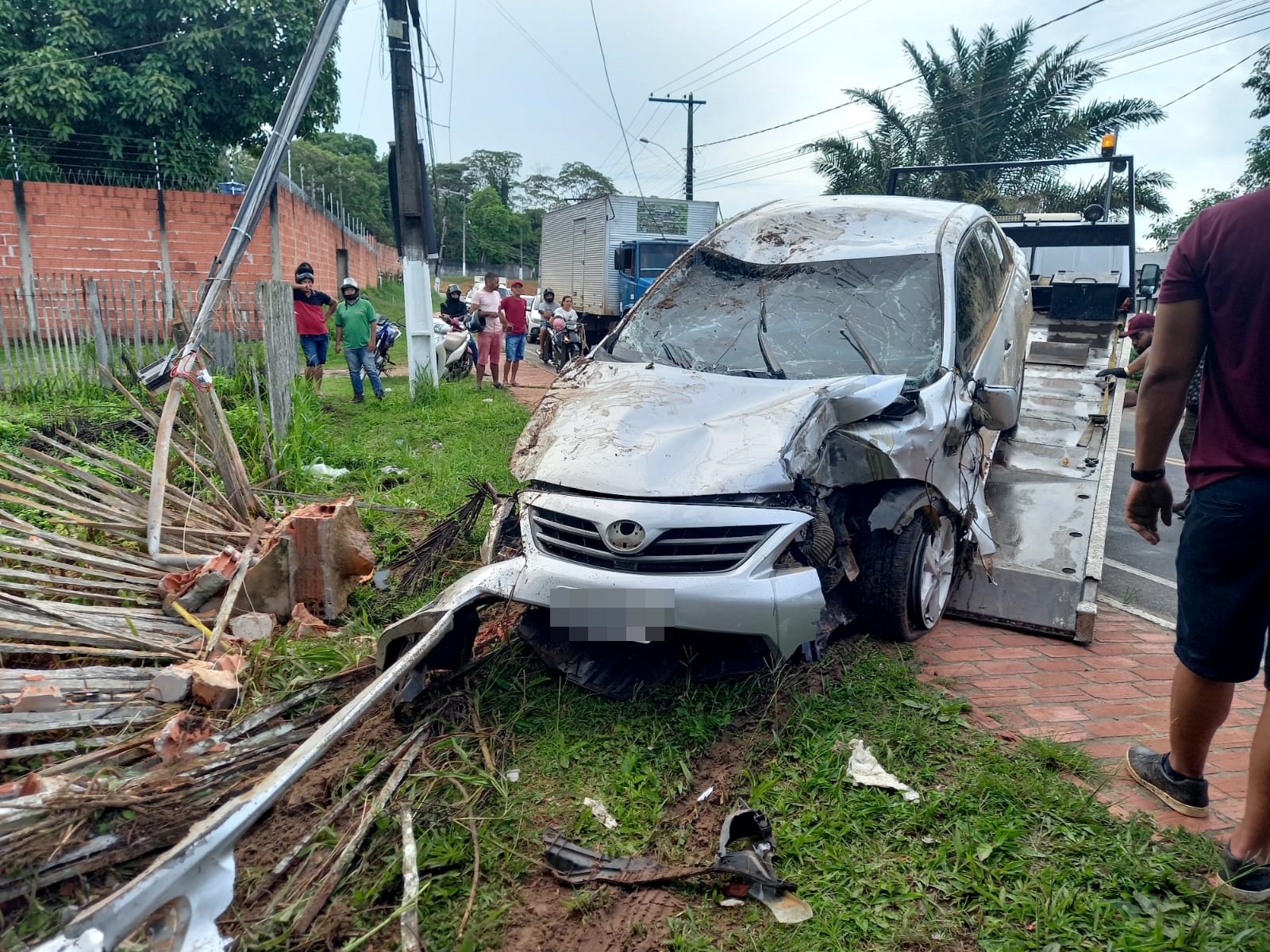 O motorista de um Corolla, na cor prata, perdeu o controle do veículo e invadiu um terreno, destruindo a cerca e derrubando um poste, deixando o local sem energia elétrica. A frente do carro ficou completamente destruída.