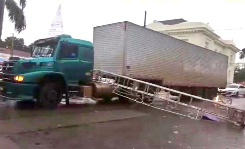 Uma carreta arrastou parte da decoração natalina montada pelo Governo do Acre, ao lado do Palácio Rio Branco, no Centro da capital acreana. O veículo estava parado e bloqueou parte do trânsito, na Avenida Getúlio Vargas.