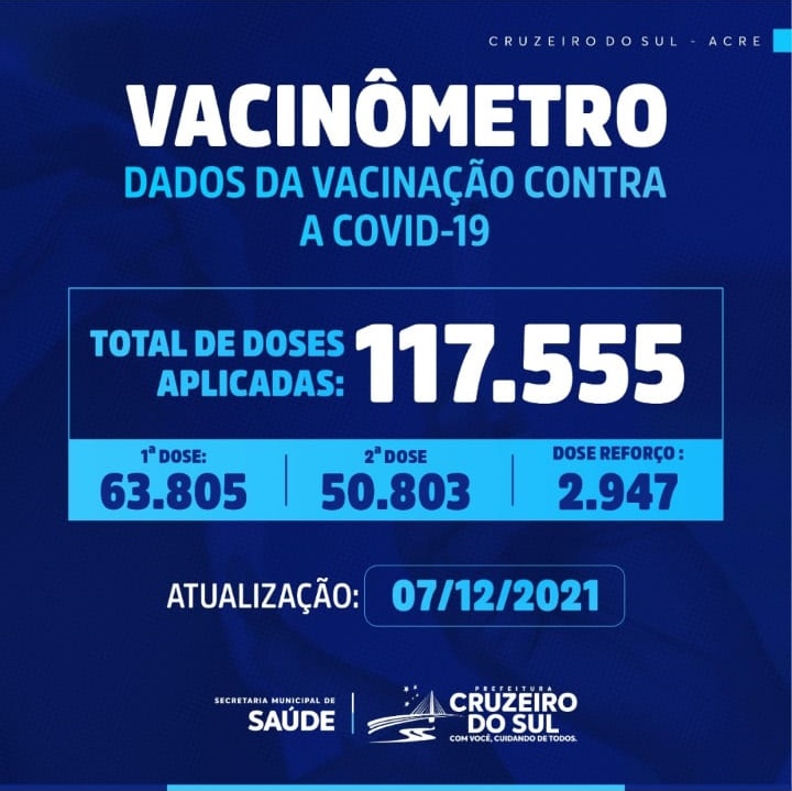 Os dados do “vacinômetro” divulgados na última terça-feira (07), pela Secretaria Municipal de Saúde, mostram que Cruzeiro do Sul já aplicou 117.55 doses da vacina contra a Covid-19. Destes números, 63.805 foram aplicadas na primeira dose, 50.803 na segunda e 2.947 na dose de reforço.